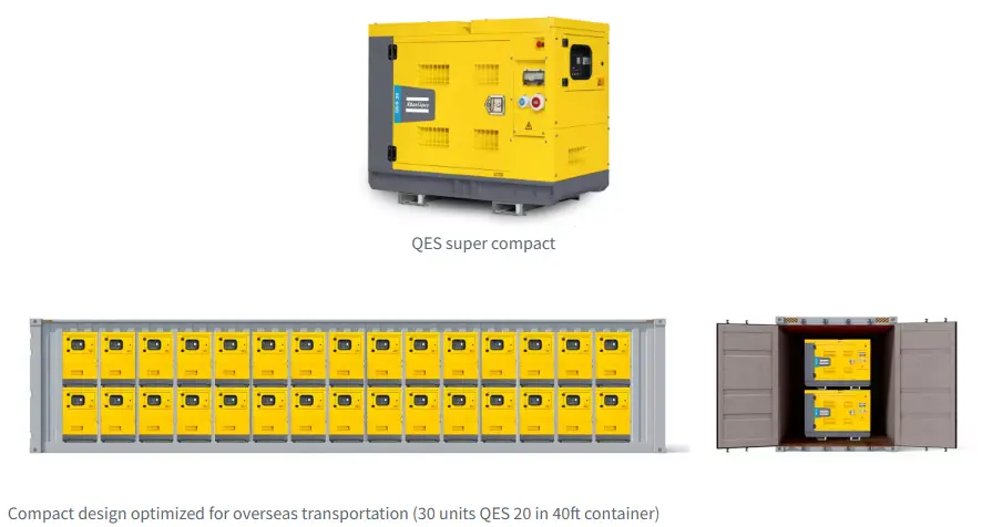 L'innovativo modello QES super compatto è progettato per garantire il trasporto più efficiente. È possibile montare fino a 30 unità di Atlas Copco QES 20 in un container da 40 piedi, il massimo per un generatore Atlas da 20 kVA sul mercato! Ciò significa trasporti ottimizzati, emissioni di CO2 ridotte e costi operativi, che si traducono in un costo totale di proprietà (TCO) inferiore. Il suo design ecologico lo rende ideale per lo stoccaggio all'estero, riducendo in modo esponenziale l'ingombro in loco.
