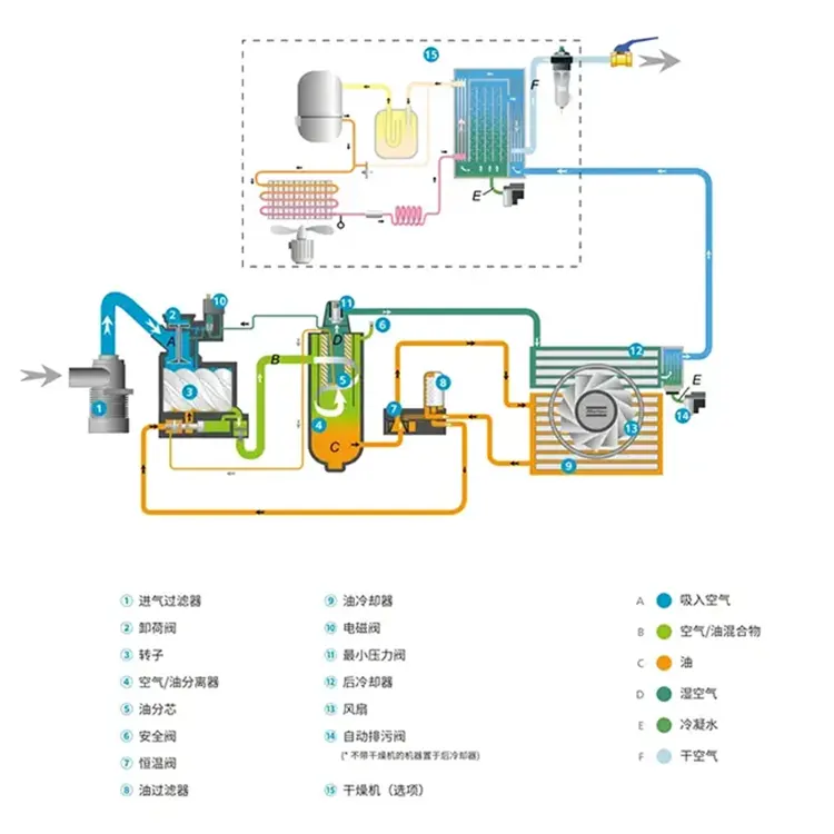 1. Fase di avvio: quando si preme il pulsante di accensione, il sistema di controllo elettronico avvierà automaticamente il sistema di lubrificazione e il sistema dell'acqua di raffreddamento del compressore d'aria. Allo stesso tempo, la valvola di aspirazione si apre e l'aria entra all'interno dell'unità principale.