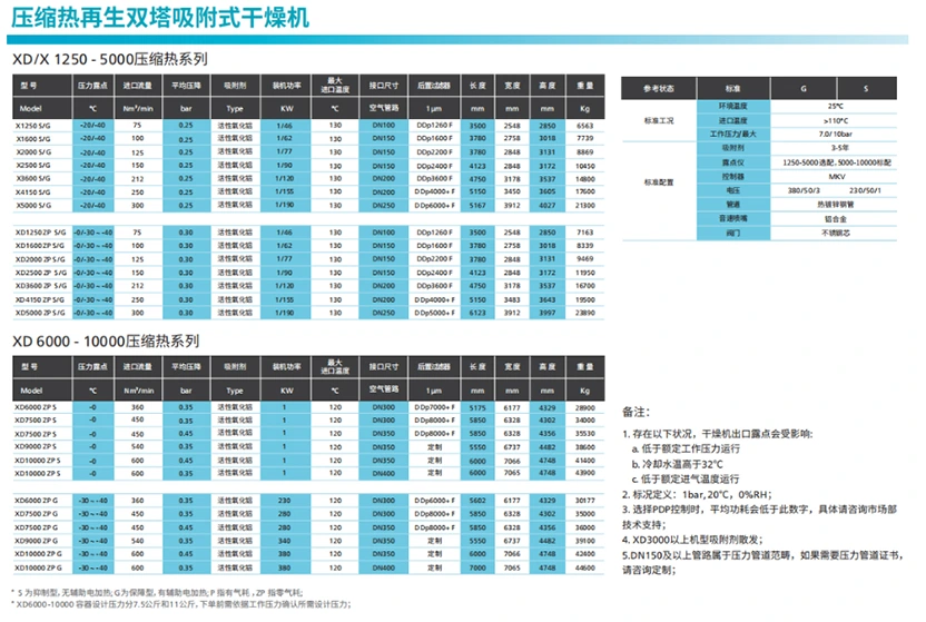 Gli essiccatori ad adsorbimento di calore a compressione XD o X utilizzano adsorbenti di alta qualità e utilizzano in modo efficiente il calore di compressione del compressore oil-free per rigenerare l'adsorbente, riducendo significativamente il consumo energetico e i costi di manutenzione.