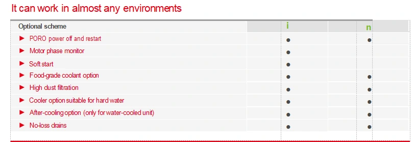 I nostri compressori offrono refrigeranti per uso alimentare, filtraggio elevato della polvere e refrigeratori per acqua dura e altre opzioni adatte ad ambienti difficili, in grado di soddisfare le vostre molteplici esigenze applicative.