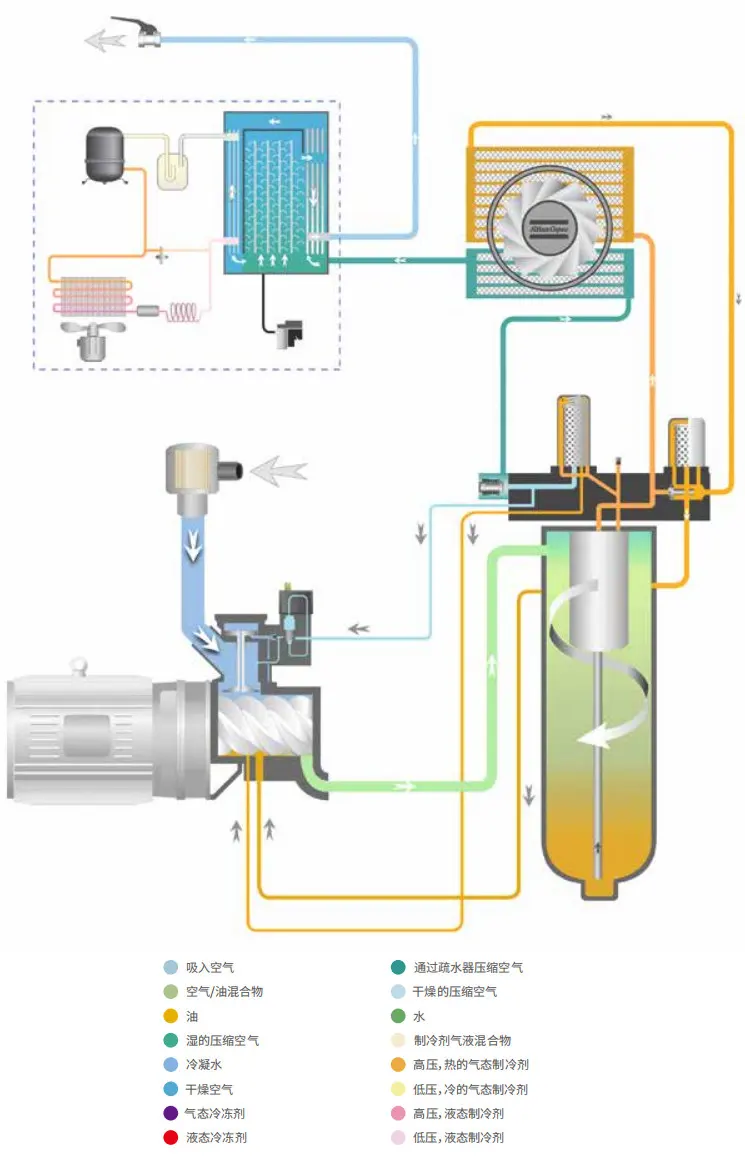 ·Il separatore d'acqua nel postrefrigeratore può sostanzialmente rimuovere l'acqua. Viene fornito di serie con una valvola di scarico elettronica per ottenere il drenaggio automatico e ridurre la perdita di aria compressa.