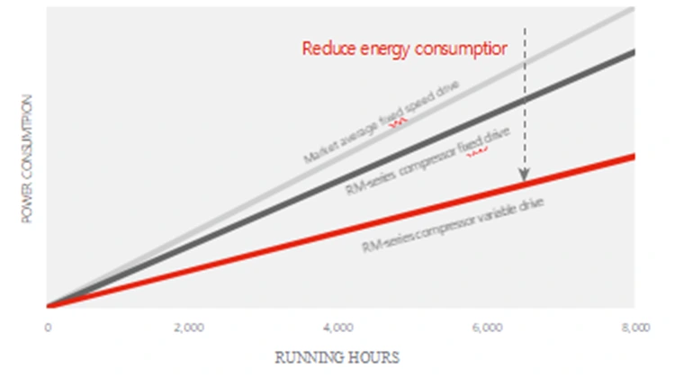 Ogni compressore d'aria della serie RM è dotato di una nuovissima unità principale ad alta efficienza, che combina un motore IE3 a velocità fissa e la tecnologia del motore a frequenza variabile ECO*-PM VSD IE5, aiutandoti a risparmiare fino al 12-30% sui costi energetici.