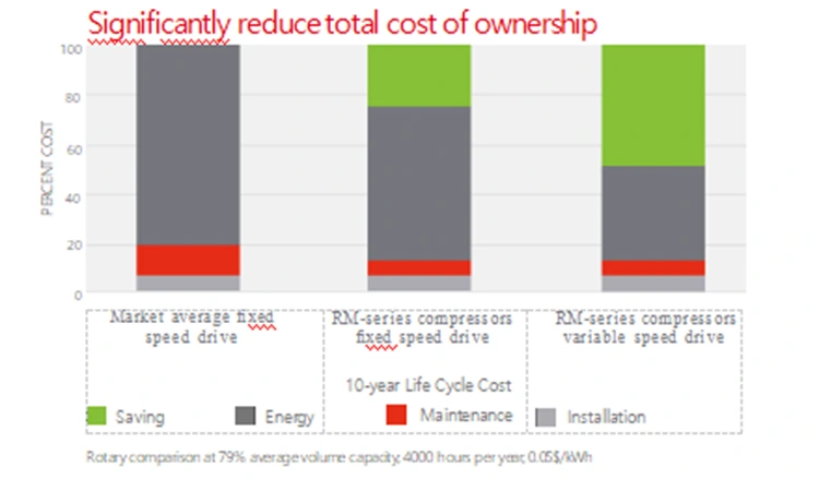 Abbiamo sviluppato la nuova serie RM utilizzando unità di compressione all'avanguardia, progettate per fornirvi prestazioni superiori. Attraverso profili ottimizzati del rotore e altri miglioramenti, il nuovo compressore raggiunge un aumento dell’11% dell’efficienza e una significativa riduzione dei costi operativi. Inoltre, il nuovo profilo del rotore raggiunge una capacità d'aria ideale, superiore dell'11% rispetto alla generazione precedente. Un rapporto peso/potenza inferiore significa costi di investimento delle apparecchiature e consumo di energia inferiori, riducendo così il costo totale di proprietà.
