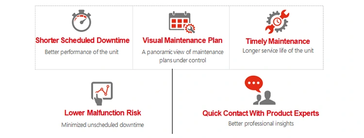Potrai usufruire della spedizione regolare di pezzi di ricambio e di promemoria per la manutenzione quotidiana, oltre a una garanzia di 5 anni sul gruppo compressore (per il nuovo compressore d'aria rotativo a vite RM a bagno d'olio)