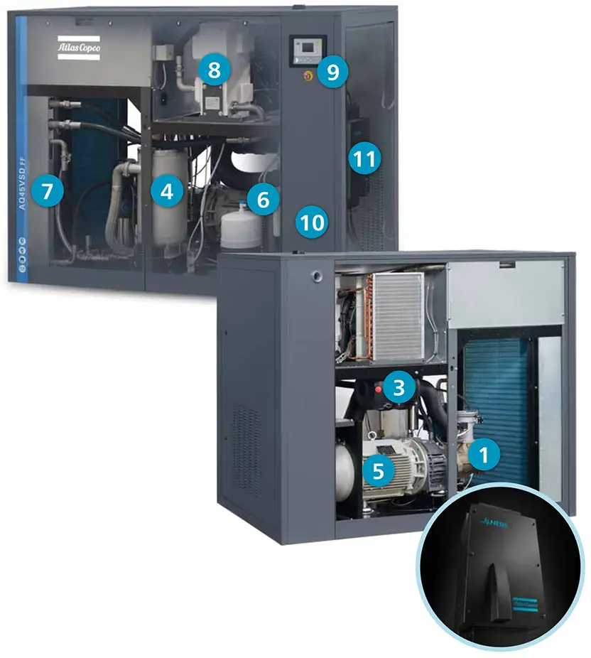Il consumo energetico del compressore rappresenta oltre il 70% del costo dell'intero ciclo di vita e la produzione di aria compressa consuma oltre il 40% della bolletta elettrica totale dell'impianto. Per ridurre il consumo energetico, Atlas Copco ha sviluppato il compressore d'aria lubrificato ad acqua VSD oil-free. La tecnologia VSD non solo consente di risparmiare molta energia, ma protegge anche l'ambiente per le generazioni future. Grazie al continuo investimento in questa tecnologia, Atlas Copco offre un'ampia gamma di compressori d'aria con azionamento a velocità variabile (VSD) sul mercato mercato.