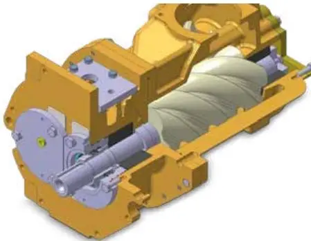 Rotore a doppia vite con iniezione d'acqua unico nel nucleo del compressore della serie AQ, funzionamento efficiente più vicino alla compressione isotermica. Rotore composito polimerico ad altissima resistenza, profilo del rotore ottimizzato e cuscinetti lubrificati con acqua assicurano che il rotore non sia contaminato dall'olio e produca aria compressa pura priva di olio.