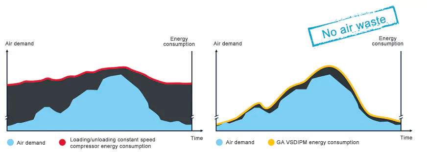 Rispetto alle tradizionali macchine di carico/scarico, il compressore d'aria a frequenza variabile VSD può risparmiare fino al 35%* di energia. Inoltre, il motore a magneti permanenti raffreddato ad olio di GVSD può avviarsi e arrestarsi sotto l'intera pressione del sistema senza scarico. Elimina inoltre l'impatto della corrente di picco durante l'avvio.