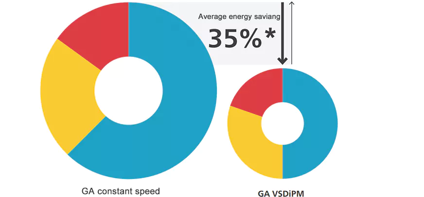I compressori ad alta efficienza della serie VSDiPM risparmiano in media fino al 35%* di energia rispetto ai compressori azionati a velocità specificate